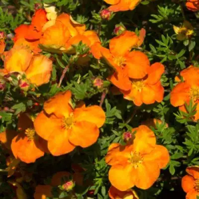 Цветы лапчатки Сансет поражают своей элегантностью. Среднего размера цветочки диаметром 2-3 см украшают кустарник с июня до сентября. Окраска этих махровых и полумахровых цветков оранжево-золотистая с красными полосками, что делает их исключительно декоративными и нарядными.
