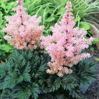 С июля по август Астильба радует глаз своими крупными ромбовидными соцветиями, окрашенными в бледно-розовый цвет с лососевым оттенком. Плотные и ажурные, они создадут атмосферу легкости и воздушности в вашем ландшафте.