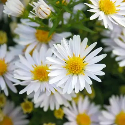 Цветение начинается в августе и продолжается около месяца. Соцветия мелкие (2,5–3 см), густомахровые, по форме напоминают миниатюрные ромашки. Лепестки заострены, окрашены в чисто-белый цвет. Центр цветка — от жёлтого до желтовато-красного. Аромат слабый, почти незаметный.