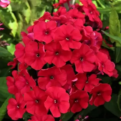 Цветение A.E. Амос — это настоящая феерия красок! Соцветия среднего размера, диаметром около 3 см, выглядят особенно эффектно благодаря своей яркой красной окраске с темно-малиновым глазком. Формой цветки напоминают колесо, что добавляет дополнительный шарм. Цветет флокс в период с июля по август, радуя вас обильным и продолжительным цветением, которое может длиться до 10-12 недель.