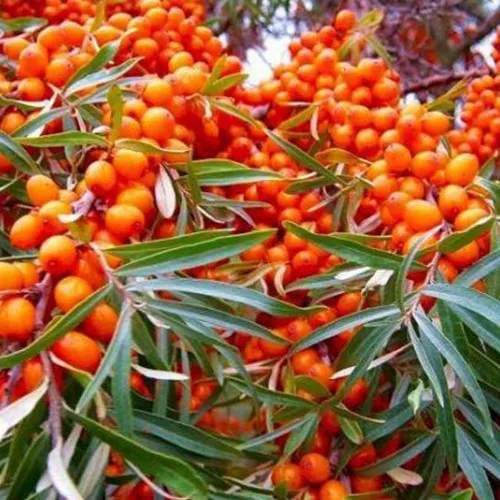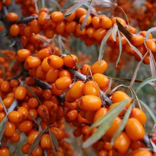 Саженцы облепихи Воробьевская отличаются мощными побегами серого цвета, которые прикрыты колючками, обеспечивающими защиту растения. Кора саженцев имеет серовато-светло-коричневый оттенок, который придает растению неповторимый шарм. Листья крупные, темно-зеленые сверху и серебристо-зеленые снизу, широколанцетной формы, что делает куст визуально привлекательным.