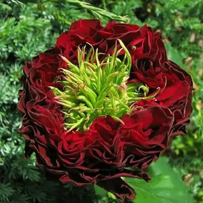 Цветок розы "Ред Ай" обладает необычной окраской. Бутон окрашен в алый цвет, а цветок самого растения имеет ярко-красный оттенок с полиферированным зеленым центром. Основная окраска цветка – красная с зелеными вкраплениями. Насыщенность цвета выражена очень ярко. Также стоит отметить, что цветки данной розы являются двухцветными, что добавляет им дополнительную изюминку. Форма цветка розетковидная, размер средний, диаметр составляет от 5 до 8 см. Лепестки цветка махровые. Цветки располагаются на стебле одиночно.