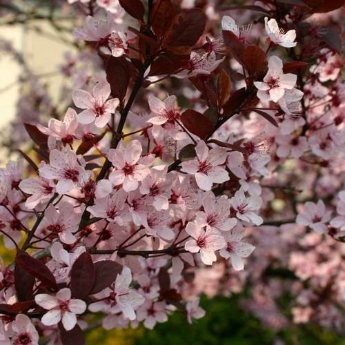 Молодые побеги сливы окрашены в насыщенные черно-фиолетовые оттенки, что создает эффект контраста с листьями. Листья растения имеют эллиптическую или яйцевидную форму, остро зубчатые и варьируются в цвете от темно-пурпурного до черно-красного. Такое многообразие окрасов делает дерево визуально привлекательным в любое время года.